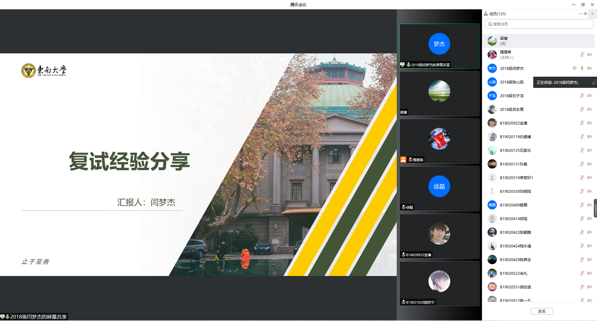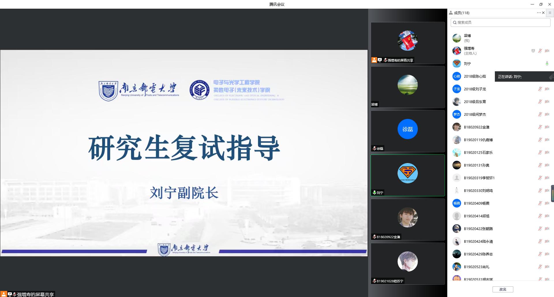 副院长刘宁从专业素养和综合素养方面嘱咐同学们提前熟悉复试流程,做好攻略,以充足准备应对复试。副书记徐磊简要为大家分析了当前考研形势,鼓励大家以积极心态应对考试,她对同学们寄予厚望,希望同学们好好努力,一举上岸!随后,闫梦杰等5位优秀学生代表依次围绕自我介绍、备考指南、复试心态、选择导师、注意事项等方面分享了自身实际经验。