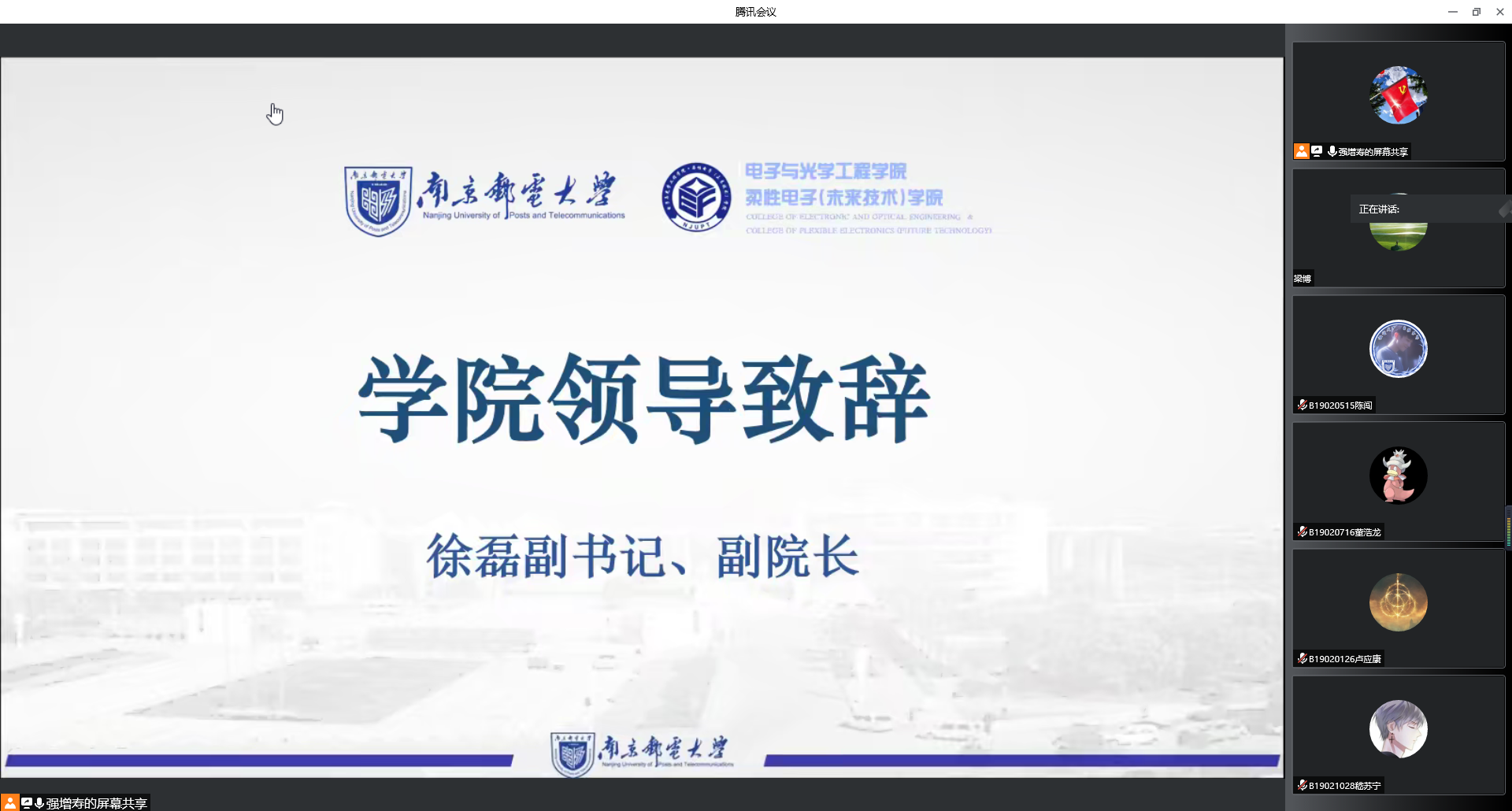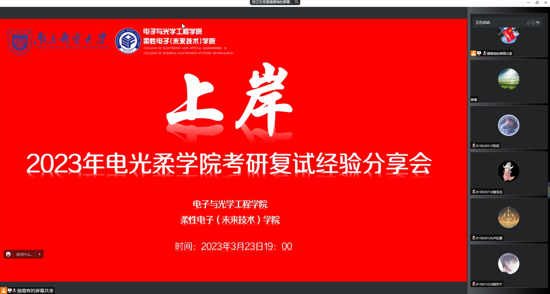 为促进学院学子更好地了解考研复试流程,为复试做好充分准备,3月23日,电子与光学工程学院、柔性电子(未来技术)学院2023届开展考研复试经验分享会。本次分享会邀请到学院副书记、副院长徐磊,副院长刘宁,2023届全体辅导员老师出席,由2022届成功考研校内外的优秀学生代表闫梦杰等5位同学分享经验,2023届考研学子参加。本次分享会由强增寿老师主持。