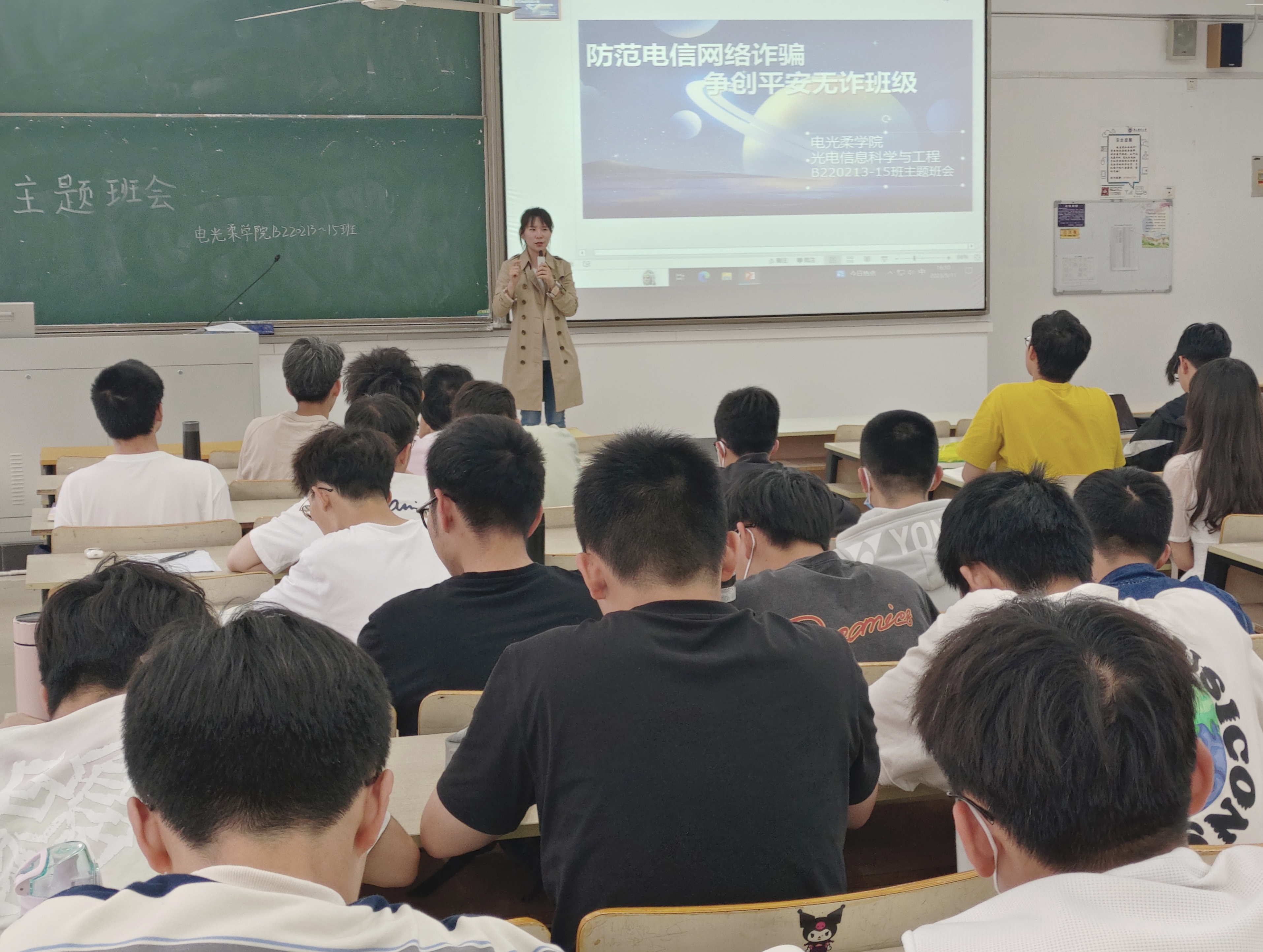 为增强班级学生防诈反诈意识,提高识骗防骗能力,5月11日下午,电光柔学院光电信息与科学专业B220213、B220214、B220215三个班级的同学齐聚教2-213,开展“防范电信网络诈骗,争创平安无诈班级”主题班会,三个班级全体同学参加了学习活动。