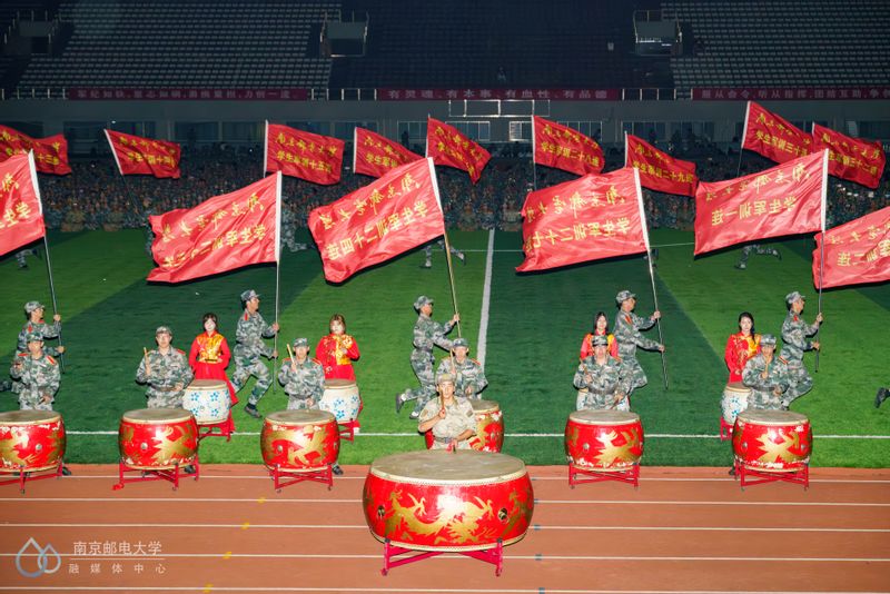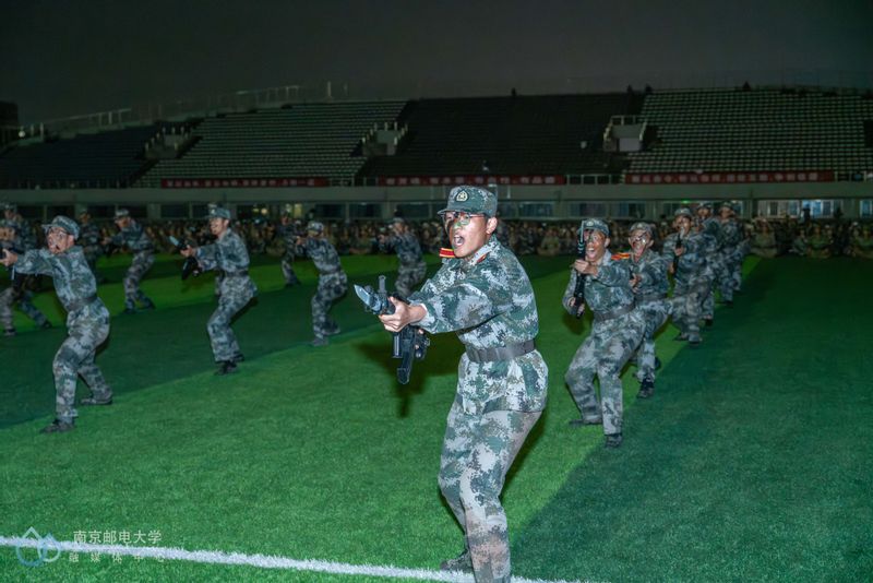 军事科目汇报上,红旗方阵手持旗帜翻腾跃动,军体拳方阵势若奔雷,刺杀操方阵列阵出击,女子匕首操英姿飒爽,展现了南邮学子热血军魂与昂扬斗志。