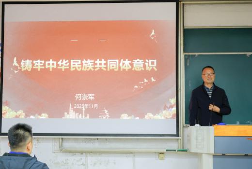 讲座最后,何老师聚焦现实,结合校园生活中发生的案例,阐述了铸牢中华民族共同体意识的时代要求,详细讲解了具体行为规范要求,强调了作为新时代青年人的责任担当。他鼓励来自全国各地、不同民族的同学在日常生活和学习中,要做到主动交往交流、全面深度交融,互帮互助、共同进步。他寄语学子,同学们不仅要在心中牢固树立民族团结意识,更要在实际行动中如“石榴籽”一般紧紧拥抱,要做新时代民族团结进步的坚定维护者和积极践行者。