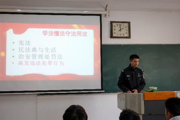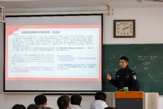 罗警官首先详细讲解了《宪法》《民法典》《治安管理处罚法》的相关内容,详细讲解了《宪法》的发展历程、重要地位、遵守《宪法》的重要性,以及编纂《民法典》的重要意义,《民法典》《治安管理处罚法》的主要构成、主要内容等。随后,罗警官结合大学生生活实际,从电信诈骗、人际交往、校园欺凌、大学恋情、治安管理、高发型犯罪等方面,通过典型案例,详细讲解了大学生日常生活中可能触及的法律红线,为同学们提供了实用的法律指南。他强调,在全面依法治国的时代背景下,法律已深度融入社会生活的各个角落,成为保障公平正义、维护社会秩序的基石,大学生学习法律知识,养成遵纪守法的好习惯,不仅是时代的要求,更是自身成长和融入社会的必修课。