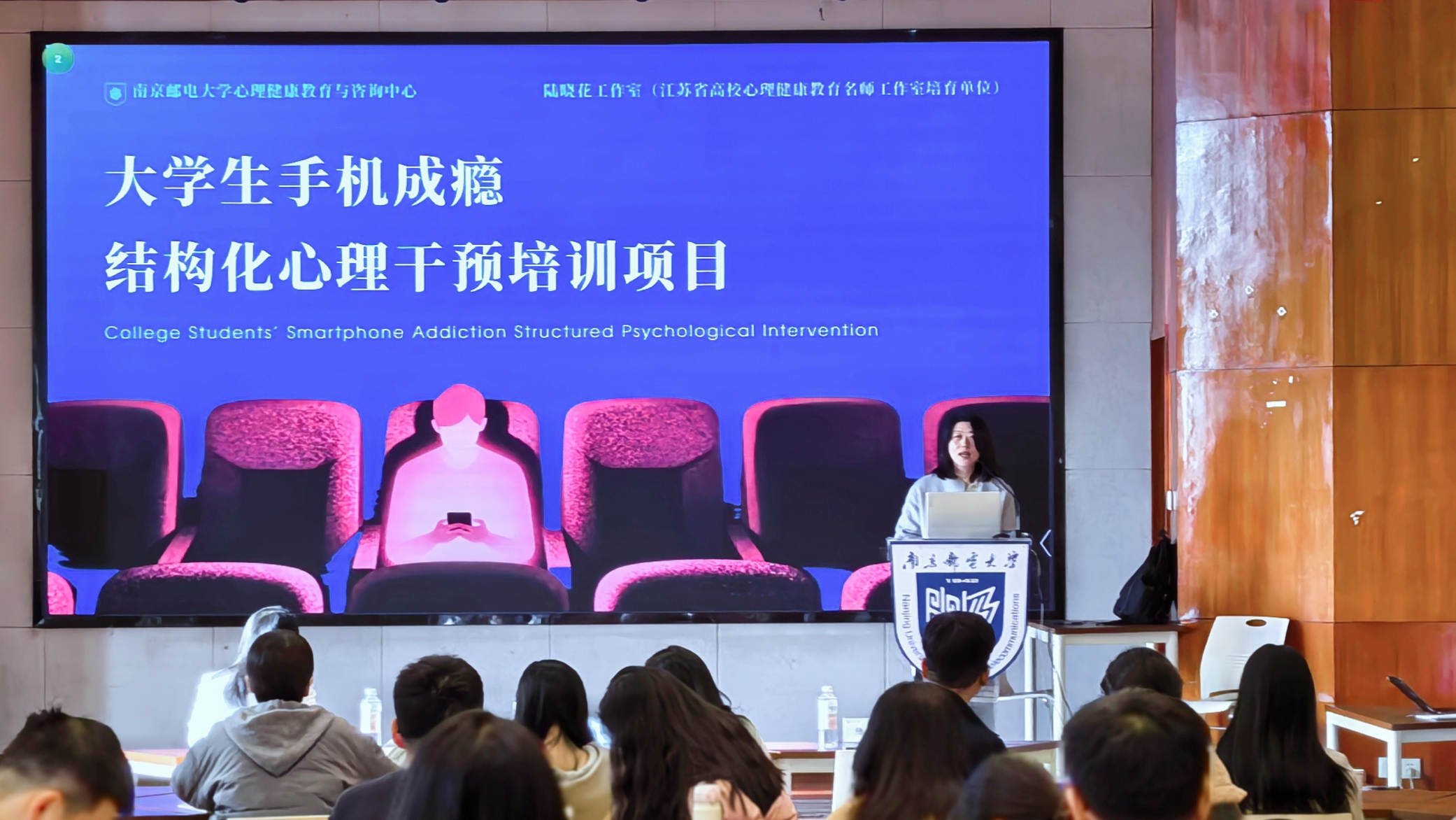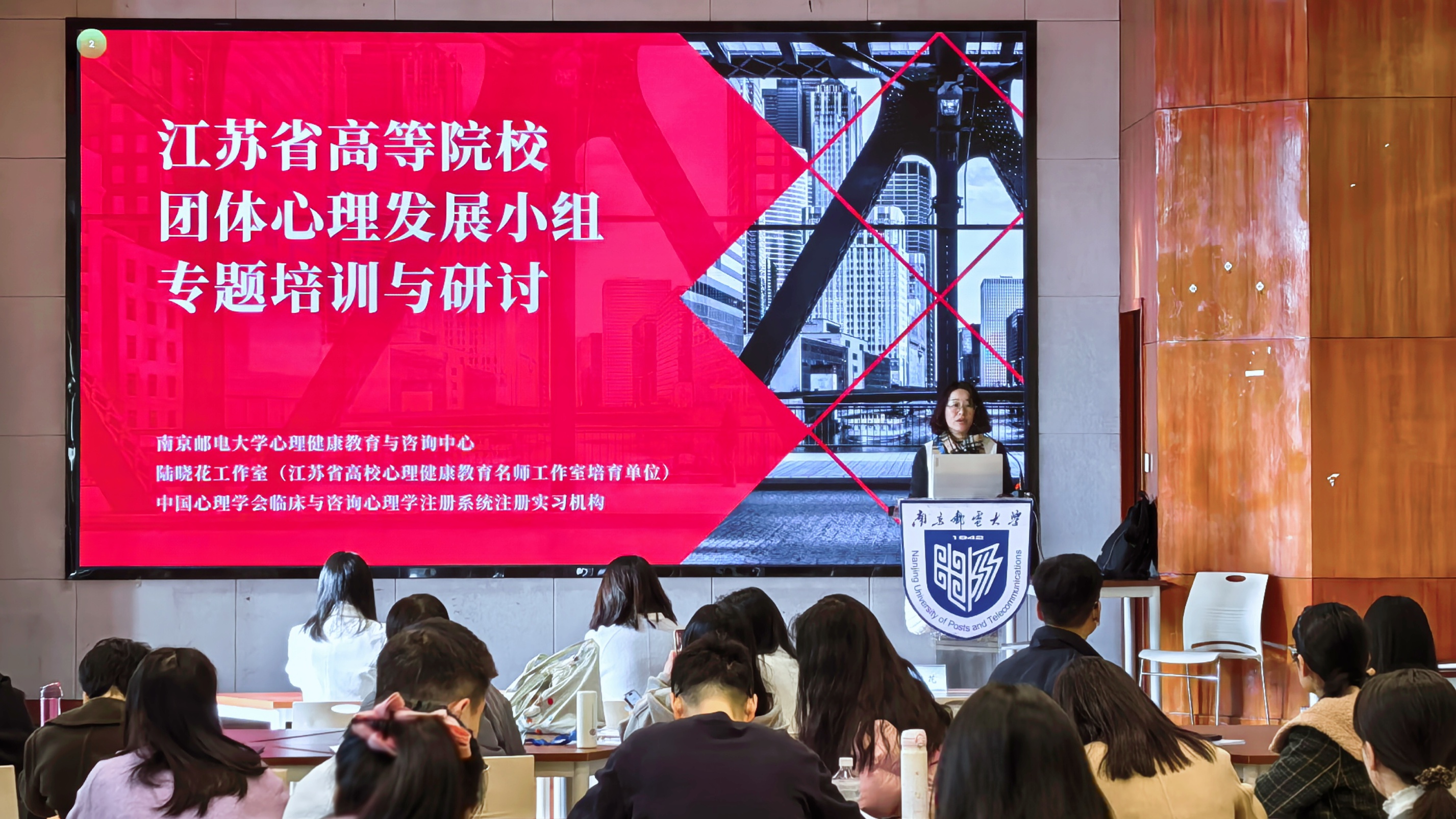 11月27日上午,培训开始,「陆晓花工作室」负责人陆晓花简要介绍了「陆晓花工作室」工作开展的情况。随后,江苏省教育厅学生处张丽娜副处长致辞,她肯定了南邮心理中心和「陆晓花工作室」在江苏省高校心理队伍中的示范模范作用,并对心理中心未来的发展提出了三点期望,希望南邮心理中心在专业队伍建设和人才培养方面继续发挥引领作用。
