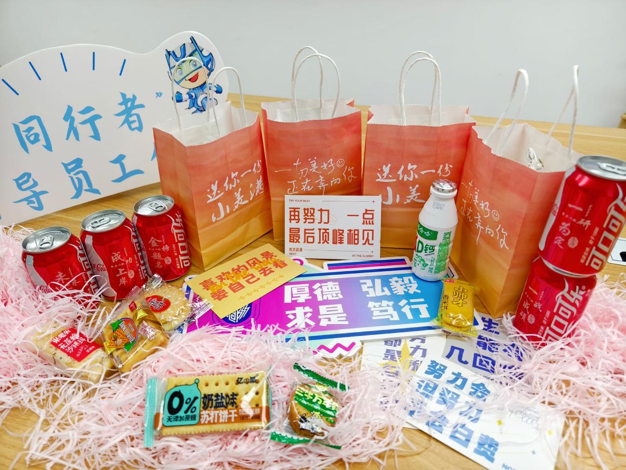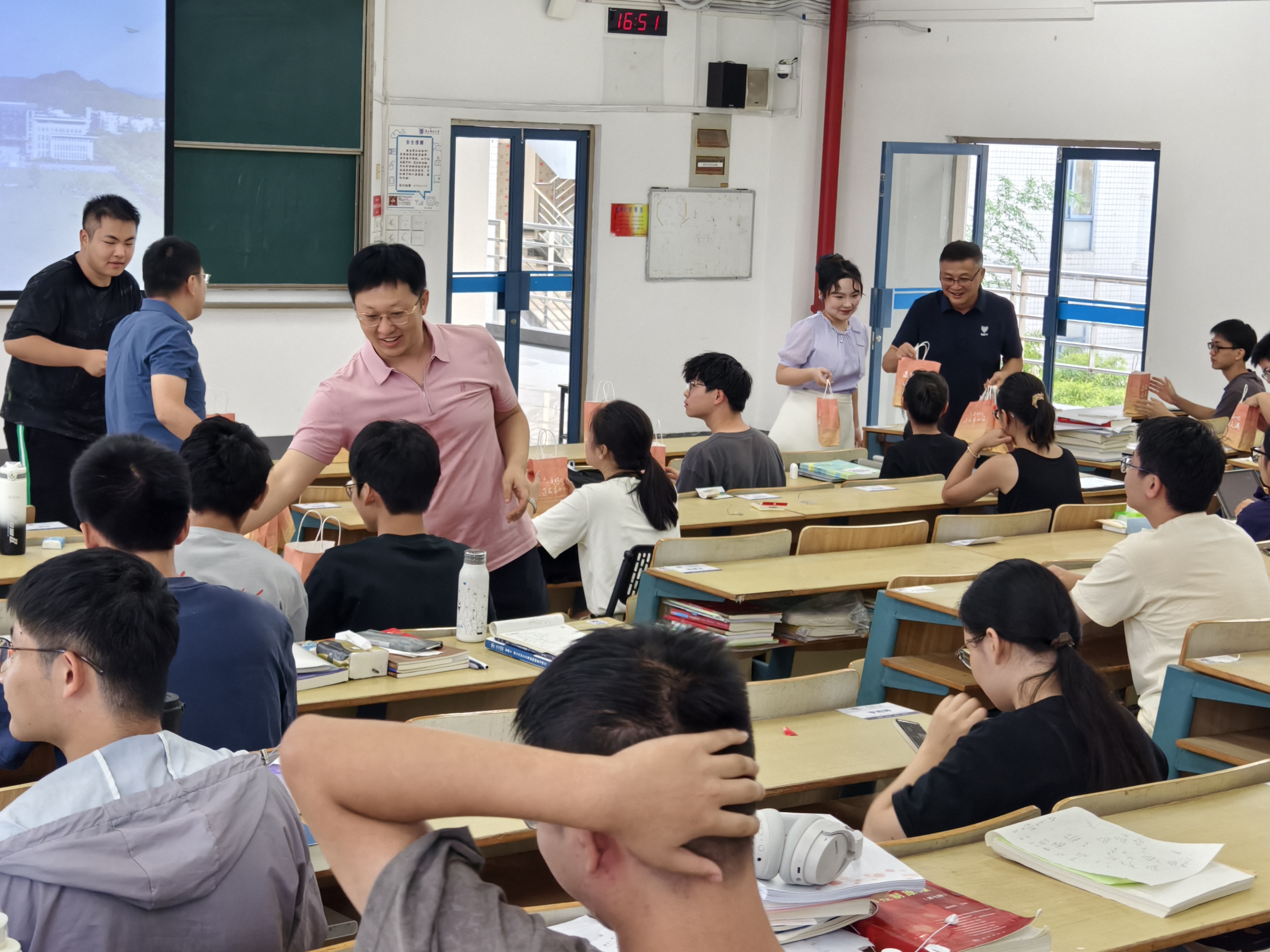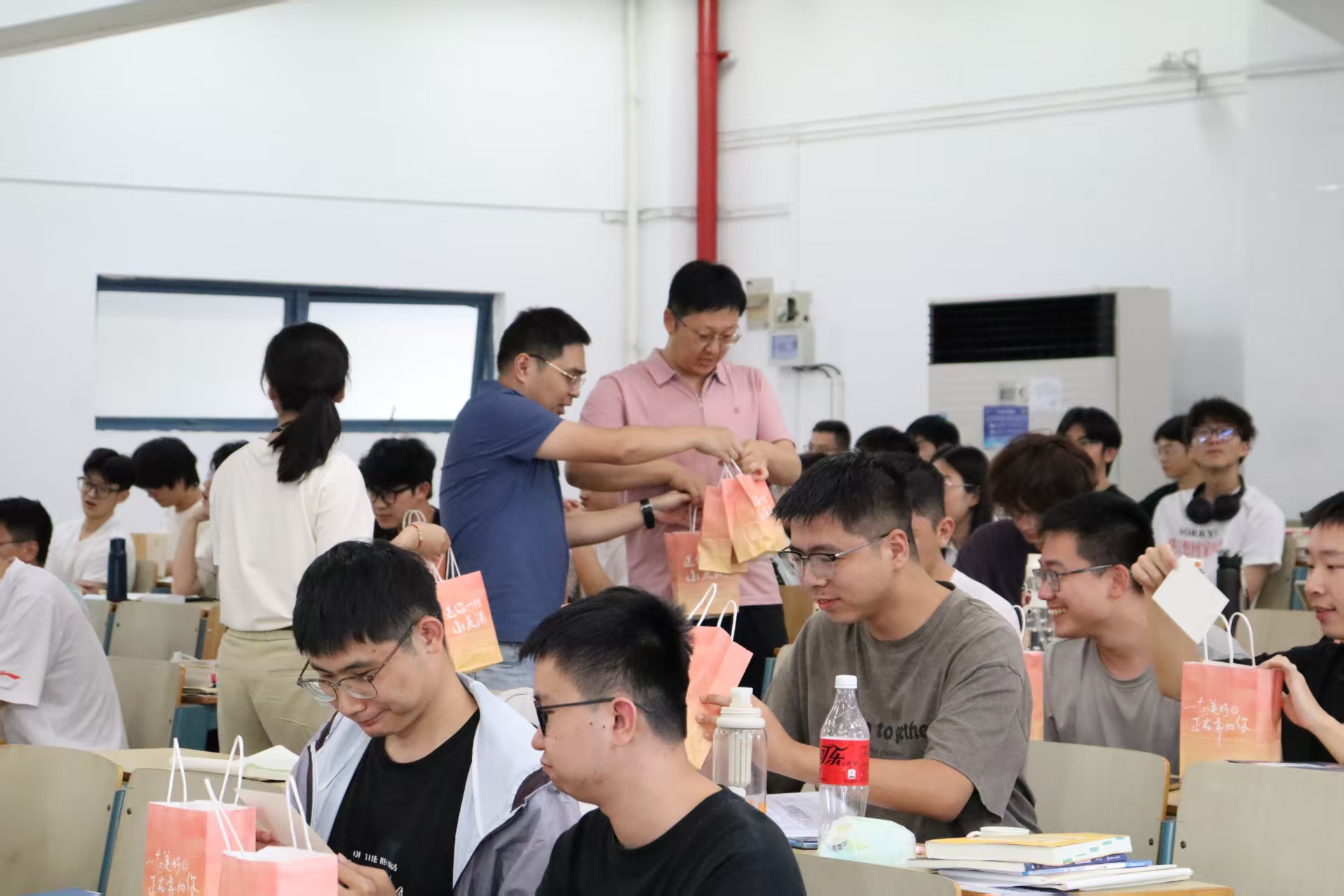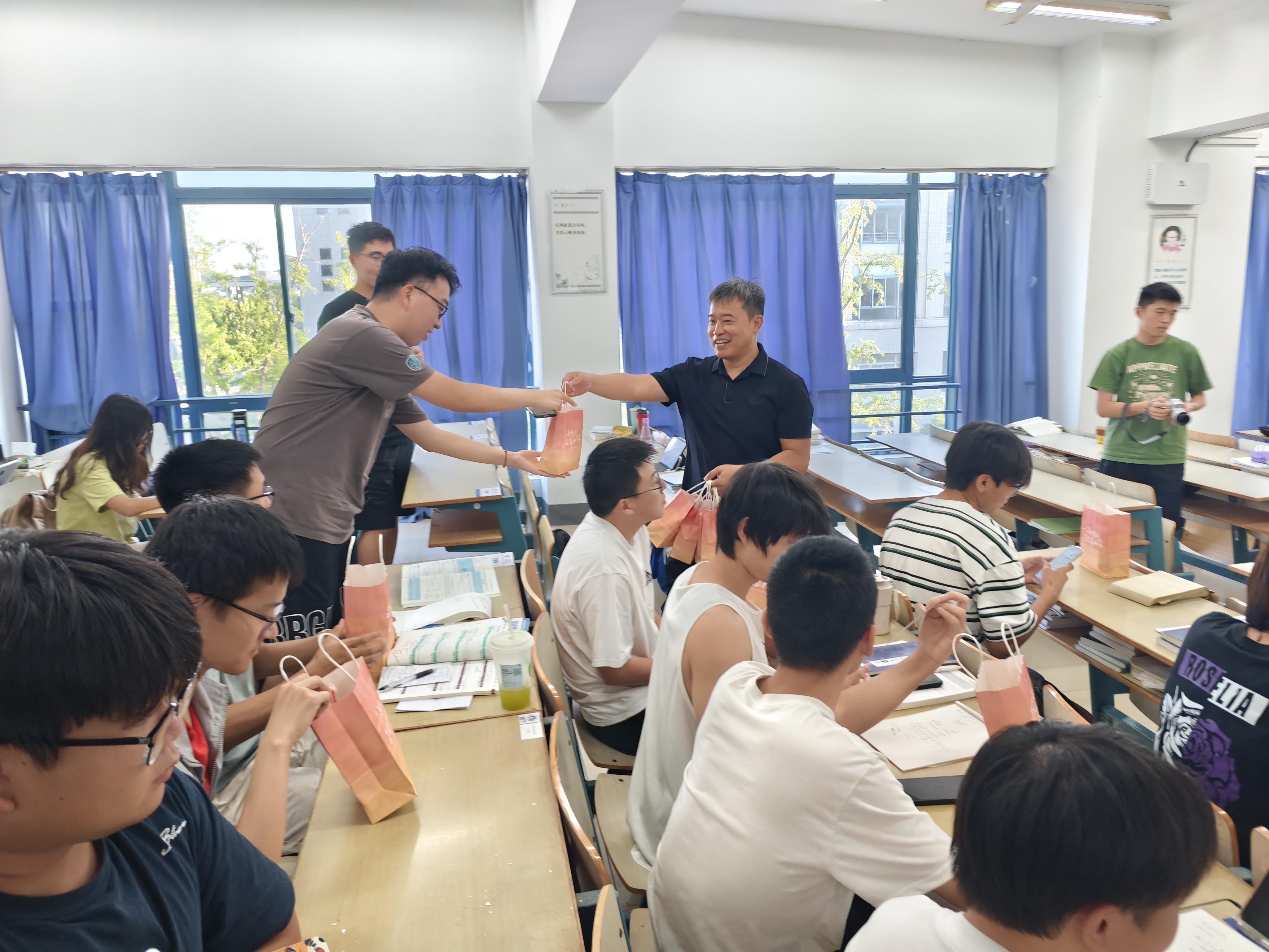 “你愿相信什么,就把世界看成什么样”,伴随《小美满》欢愉的BGM,在温馨的礼品发放环节,三位领导和辅导员桑学峰老师、齐沁儿老师,亲手将准备好的慰问品送到每一位同学手中。定制的明信片上印着“研途有你,未来可期”的字样,与众不同的可乐盲盒、能量补给的零食套装,每一份礼物都饱含着学院的关怀。“谢谢老师!收到礼物感觉更有动力了!”一位同学接过礼物时激动地说,现场不时响起阵阵掌声,温暖的氛围驱散了夏日的燥热。