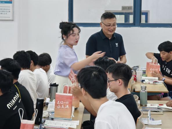 辅导员桑学峰老师主要承担了零食大礼包的采购工作,在将亲手包装的礼物送至同学们手中时,桑老师说:“凌晨的台灯下藏着大家的坚持,堆积的真题里写满大家的决心,偶尔的疲惫和焦虑也从没有让同学们停下脚步。衷心祝愿每一位勇敢追梦的同学,都能在明年春天收到心仪院校的录取通知书!”