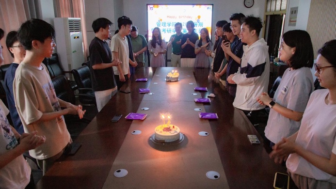 为深入了解暑期留校考研学子的思想动态、学习进展与生活需求,传递学院暖心关怀,帮助同学们舒缓备考压力、坚定奋斗信心,7月25日下午,管理学院精心组织了一场温馨的“暑期留校考研学子慰问暨集体生日会”活动。学院党委书记葛敏教授,副书记、副院长郭强教授,2026届毕业班辅导员一同深入考研自习室,看望慰问正在紧张备考的同学们,并为暑期过生日的28位学子送上特别的集体祝福。