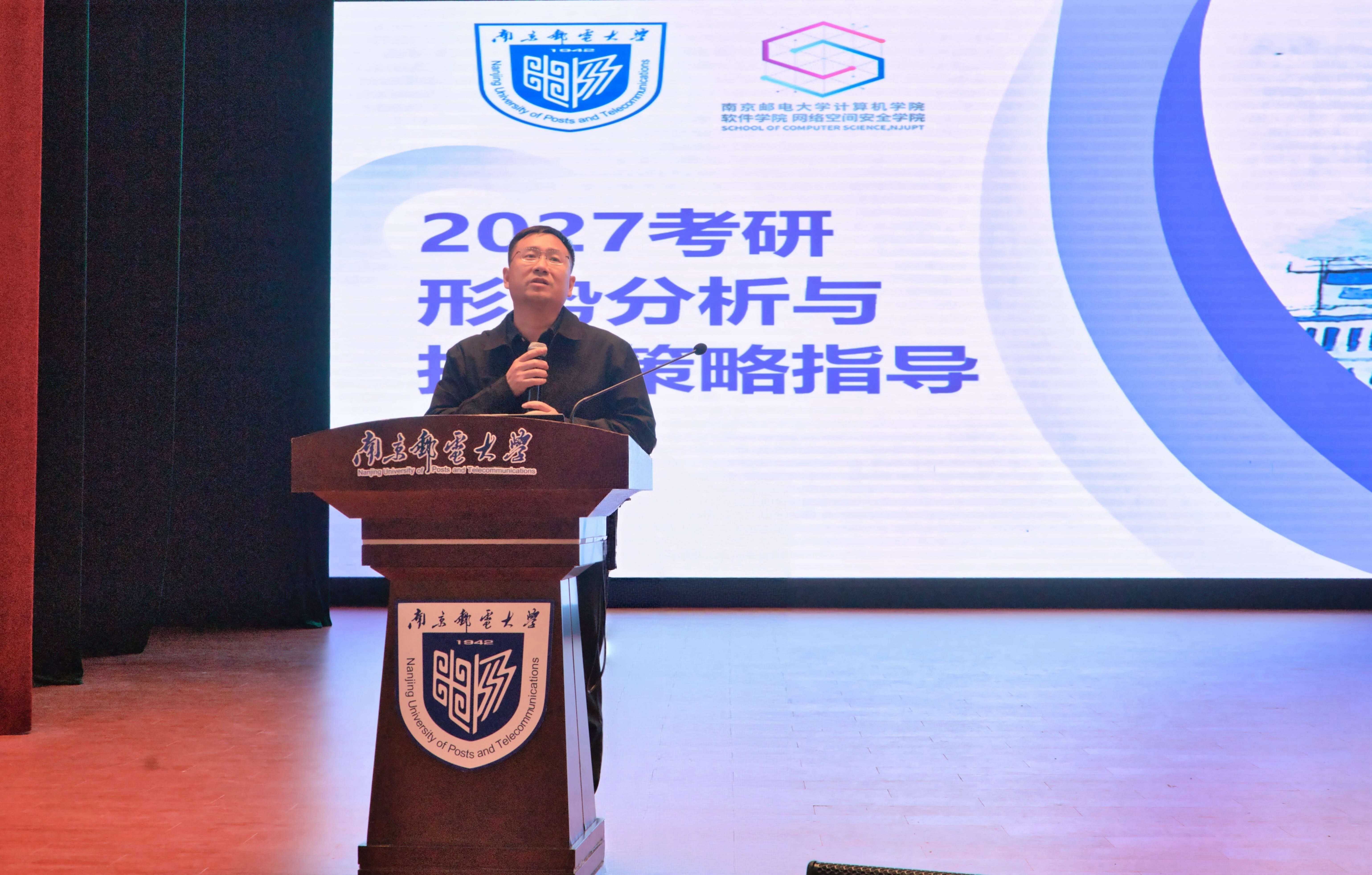 而后,学院副院长戴华老师以详实数据为支撑、以实用策略为核心,为同学们展开了一场干货满满的考研指导。他结合最新考研大数据,细致拆解了当前考研的地域偏好特征,深入分析了本院历届毕业生的上岸院校层次分布规律,用客观数据凸显了“精准定位、科学择校”在考研中的决定性作用。在报考策略分享中,戴华老师提出“优择师,重择校”的方针,并解读了考研全流程的关键节点与规划技巧。同时,他从学科发展历程、学科概况、学科排名、人才培养、竞赛成就、科研平台优势等多个维度,全面展现了南京邮电大学计算机相关专业的深厚底蕴,让同学们清晰认识到,本校实为考研深造的优质沃土与明智之选。