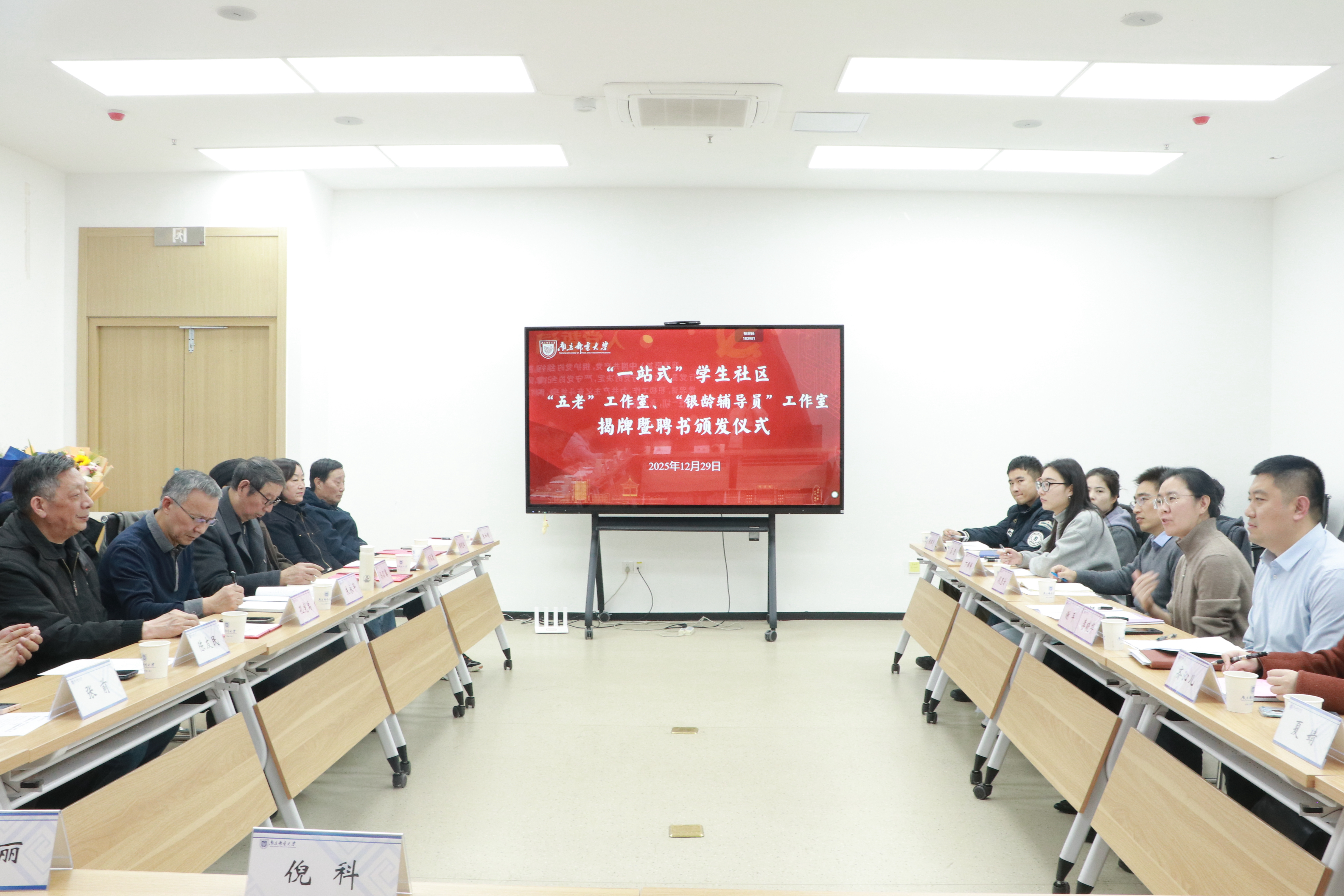 12月29日下午,我校在仙林校区“一站式”学生社区306会议室举行“五老”工作室、“银龄辅导员”工作室揭牌暨聘书颁发仪式。校党委常委、副校长谢平,校关工委常务副主任朱永平,学生工作处、离退休工作处相关负责人,校关工委领导小组成员,“银龄辅导员”代表,青年辅导员代表参加仪式,仪式由学生工作处处长李晓华主持。