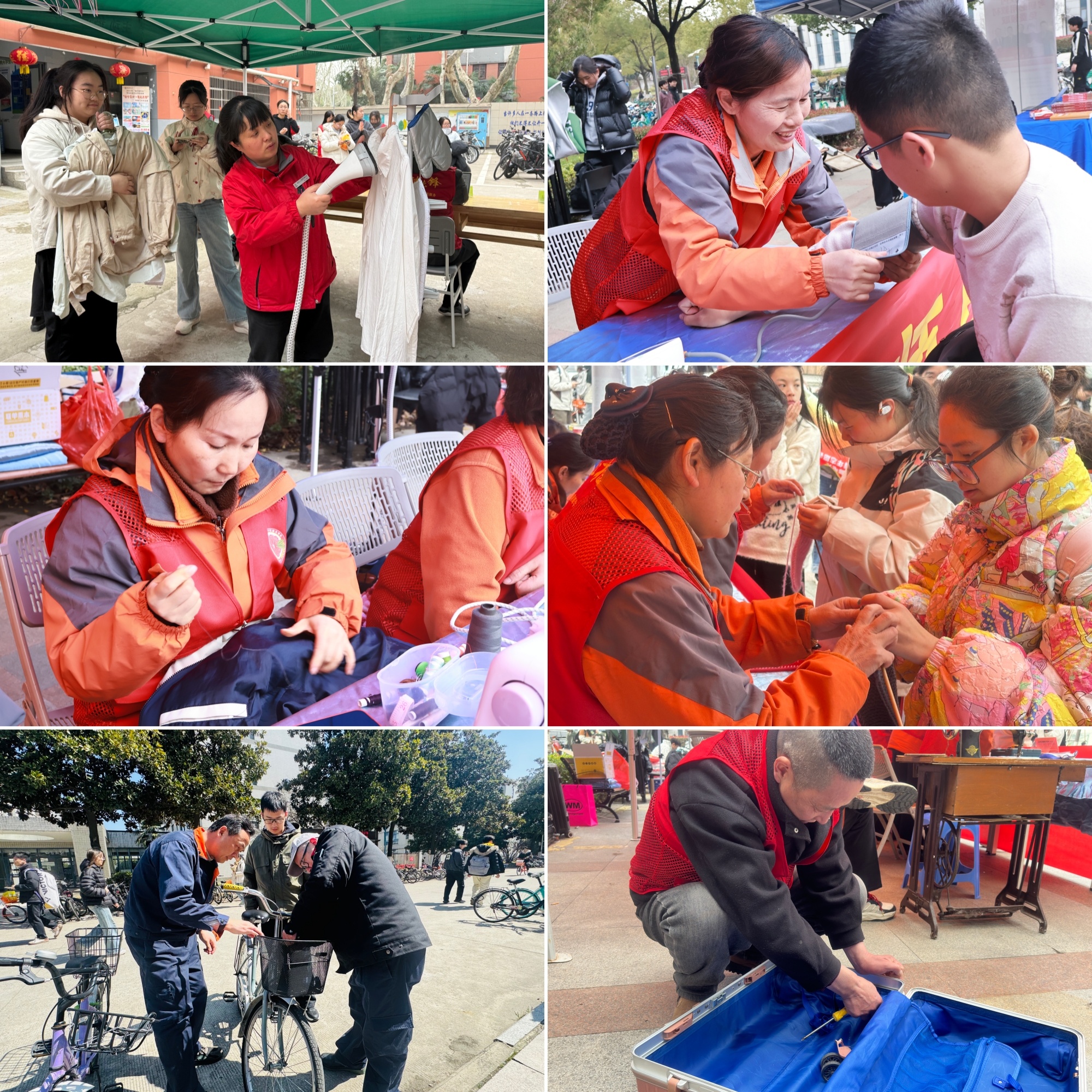 在南二、南三食堂广场,宿管人员与学生志愿者共同搭建爱心服务台,提供衣物缝补、测量血压、日用品维修等服务。宿管阿姨们拿起针线,穿针引线间,将开线的衣物缝补得严丝合缝,并现场教授同学们织毛衣、熨烫等技能。维修工师傅们也发挥所长,对学生的自行车、行李箱等物品提供保养和维修。活动现场人头攒动,一句句真挚的谢谢,一次次温暖的微笑,交织成春日校园里最动人的画面。