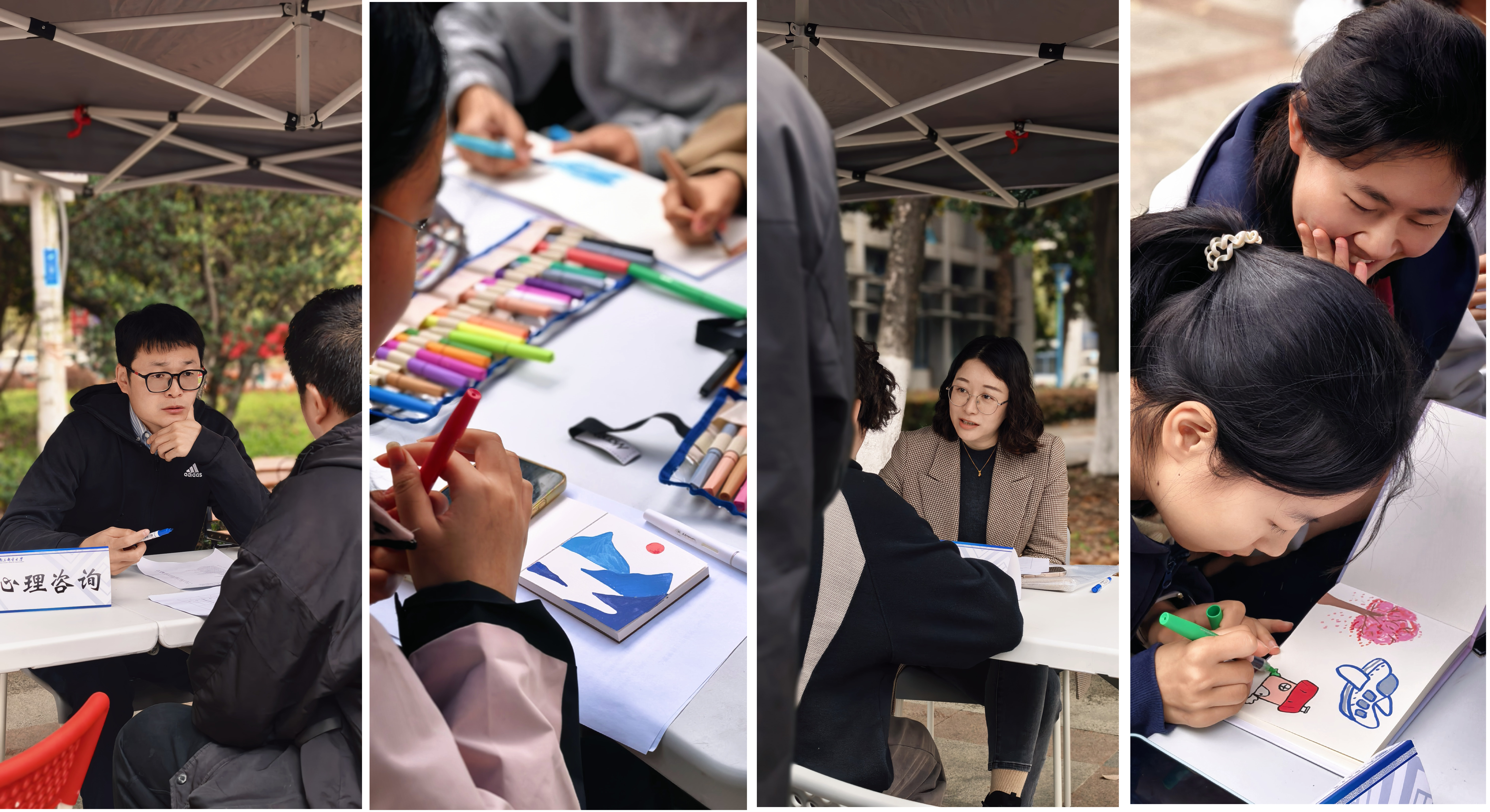 作为心理中心常规化开展的主题活动之一,本次广场心理活动推陈出新,保留了以往较受同学们欢迎与喜爱的心理测验、心理咨询体验、沙盘体验等主题活动,同时增加了歌词接龙、诗歌接龙、丙烯绘画等有趣、好玩,又不乏深度的新项目体验。