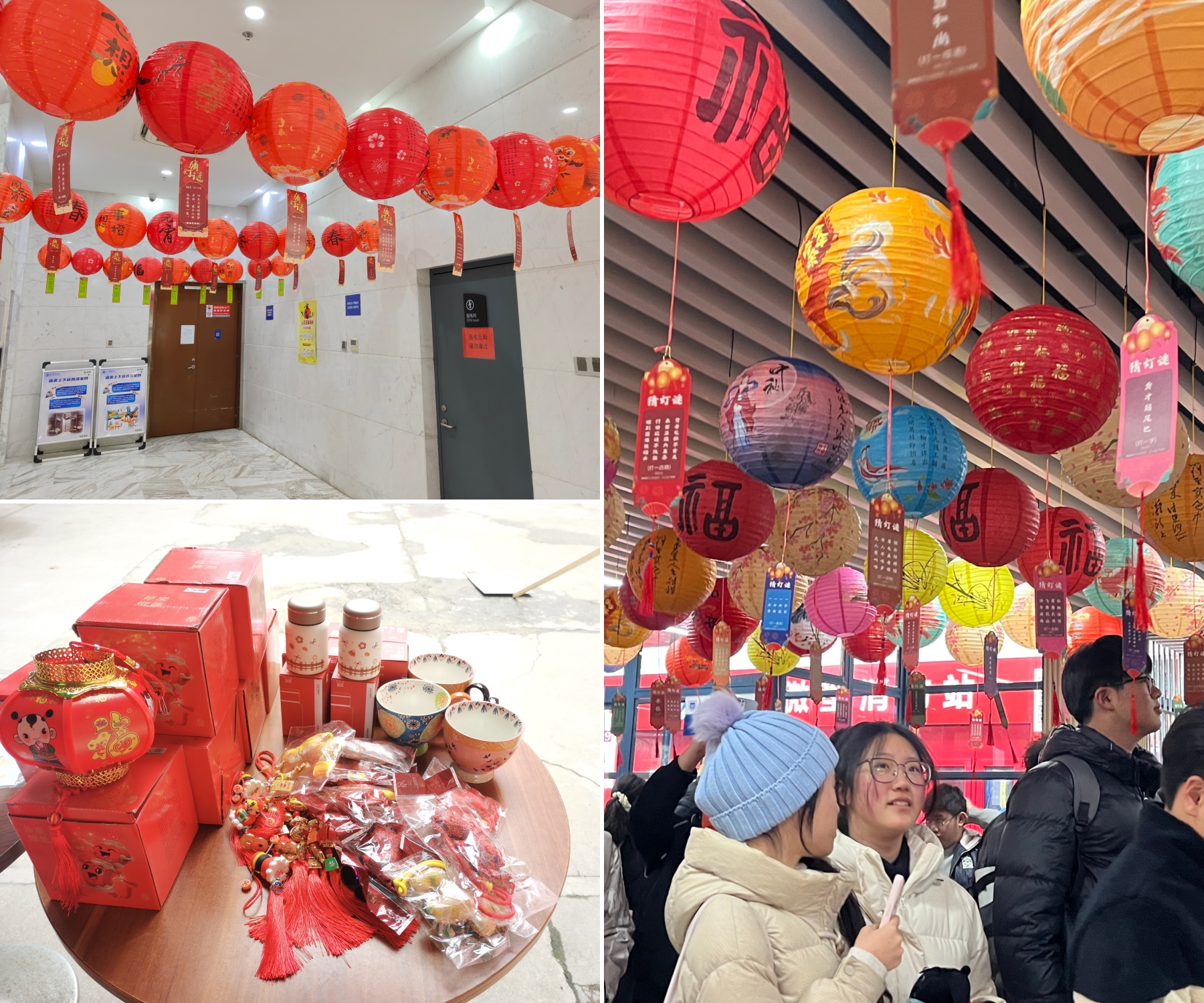 灯笼高挂,年味浓郁。各宿舍苑区精心布置,喜庆红火的灯笼与温馨活泼的节日装饰相映成趣;游戏区玩偶、奖品整齐陈列,宿舍区张灯结彩,处处洋溢着热烈浓厚的节日气息。