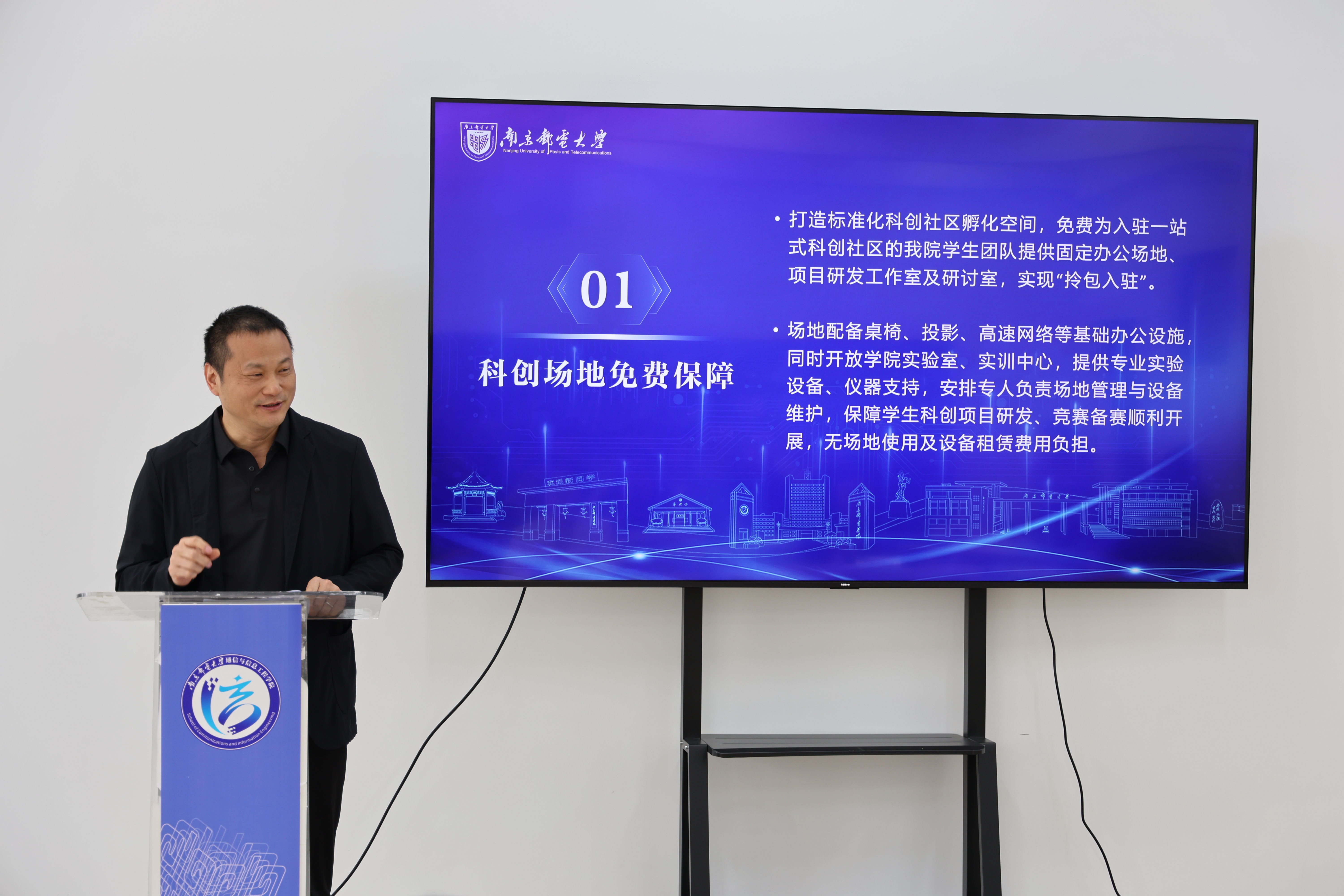 4月20日,南京邮电大学通信与信息工程学院“一站式科创社区”在仙林校区正式揭牌启用。这一创新平台的落成,不仅是学校深化“一站式学生社区”建设的标志性成果,更是学院推动科创育人模式系统性变革、响应国家科技自立自强战略的关键举措,开启了科创育人从“活动化”向“生态化”转型的新篇章。学校党委常委、副校长姜小舜,对外联络处处长盛利、校团委书记秦昌建、党委学生工作处副处长段惠方等职能部门负责人,南京艾瑞智赢信息技术有限公司董事长杨利霞、总经理徐彬等企业代表,通信与信息工程学院领导班子、全体辅导员、科创指导教师代表及学院科协全体成员出席仪式。